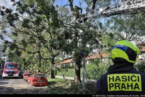 Hasiči zasahují u spadlého stromu na auta. Foto: HZS Praha/Jiří Dvořák