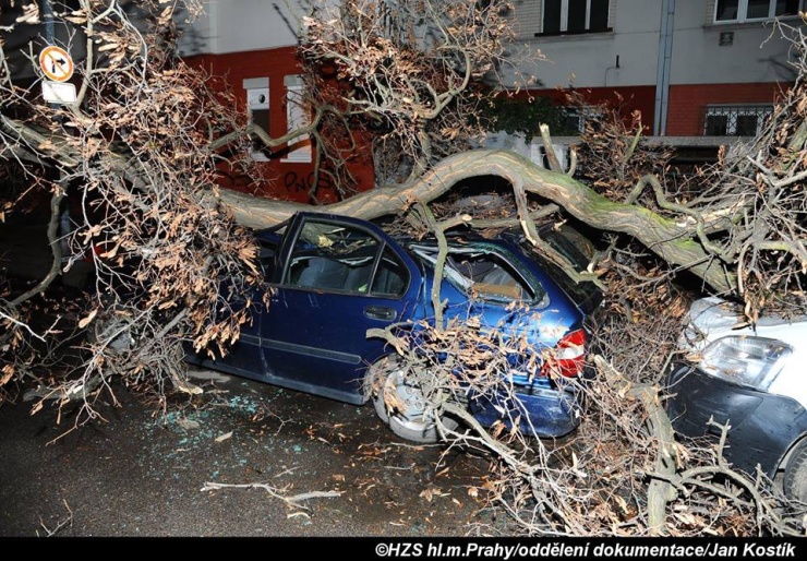 PRAHA – Před půlnocí spadl strom na pět zaparkovaných vozidel v ulici Ukrajinská v Praze 10. Hasiči kmen rozřezali motorovou pilou.