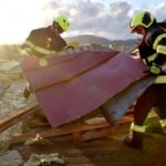 OSTROV – Polovina plechové střechy včetně dřevěných krovů spadla po silném poryvu větru v neděli v Ostrově na Karlovarsku. Trosky střechy poškodily zaparkovaná vozidla před budovou.