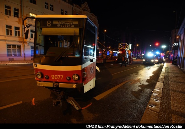 OBRAZEM: Tramvaj byla po nehodě s osobním vozem v pražském Karlíně mimo kolejiště, velitel hasičů povolal speciální vyprošťovací automobil