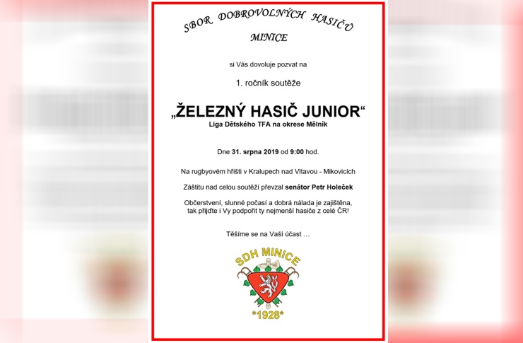 MINICE / KRALUPY NAD VLTAVOU – Sbor dobrovolných hasičů Minice pořádá 1. ročník soutěže ŽELEZNÝ HASIČ JUNIOR. Jde o Ligu DĚTSKÉHO TFA na okrese Mělník.