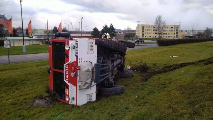 EDIT: Jednotka podnikových hasičů údajně nemířila k ohlášené nehodě, kdy osobní automobil na náledí dostal smyk a skončil na střeše, hasiči podniku jeli údajně kolem karambolu takzvanou kondiční jízdu a rovněž dostali smyk a havarovali jen pár desítek metrů od původní nehody…