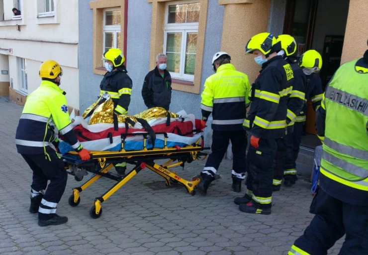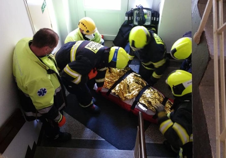 K události došlo dnes před jedenáctou hodinou. Pomocí lezecké techniky a speciálních nosítek hasiči následně transportovali muže do sanitního vozu záchranářů.