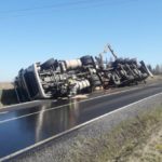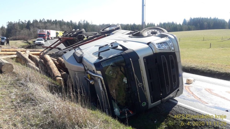 PLZEŇSKO – Souprava se převrátila na bok. Náklad se vysypal mimo komunikaci. Jednu zraněnou osobu jsme předali ZZS.