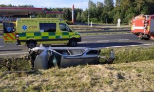 U Dolních Břežan skončilo po nehodě osobní auto na boku! Záchranáři převezli do nemocnice tři zraněné