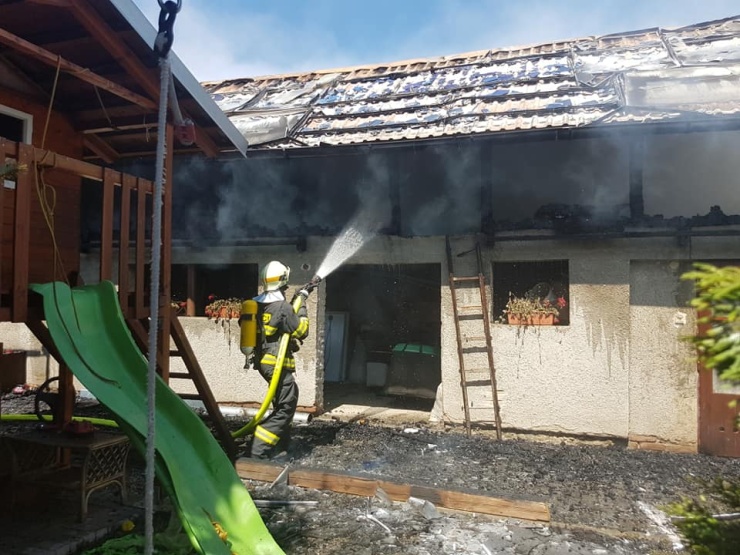 OBRAZEM: U požáru rodinného domu v Bezuchově na Přerovsku, kde hořela střecha v celém rozsahu a část podkroví zasahují hasičské jednotky