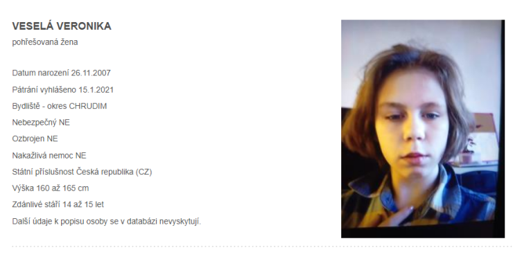 Pokud víte kde je, nebo jste ji někde zahlédli, volejte chrudimským policistům přes tísňovou linku 158. Více naleznete zde. Je-li odkaz neaktivní, bylo pátrání odvoláno. (zatím se tak bohužel nestalo)