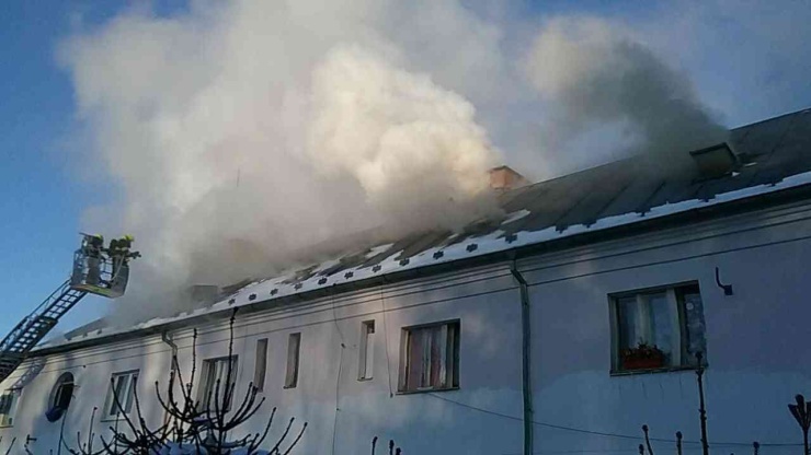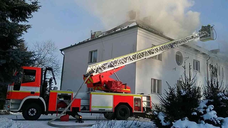 CHODOV – V Chodově na Sokolovsku zasahují hasiči u požáru střechy bytového domu. Po zpozorování požáru opustilo objekt 34 osob, hasiči pro ně s ohledem na mrazivé počasí na místo zajistili evakuační autobus.