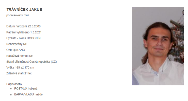 Intenzívní pátrání po dvacetiletém Jakubovi Trávníčkovi z Hodonínska stále pokračuje. Muže policisté zanesli i do databáze hledaných a pohřešovaných osob na portálu Policie ČR: ZDE. (V případě, že odkaz policejní databáze již nebude aktivní, byl muž vypátrán. zatím se tak bohužel nestalo).