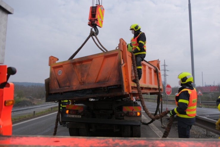 Ostravští hasiči zasouvali u dálnice nakloněnou korbu s asfaltem zpět na auto