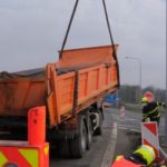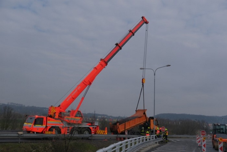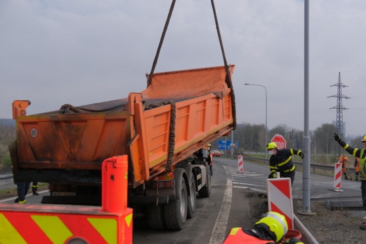 OSTRAVA – Dvě jednotky profesionálních hasičů (HZS MSK) zasahovaly v úterý  na kruhovém objezdu nad dálnicí D1 v Ostravě-Přívoze, kde hrozil pád nebezpečně nakloněné ložné plochy nákladního automobilu Mercedes s deseti tunami asfaltové směsi, připravené na pokračující rekonstrukci části vozovky kruhového objezdu. K posunu korby patrně došlo po kontaktu s jiným vozidlem.