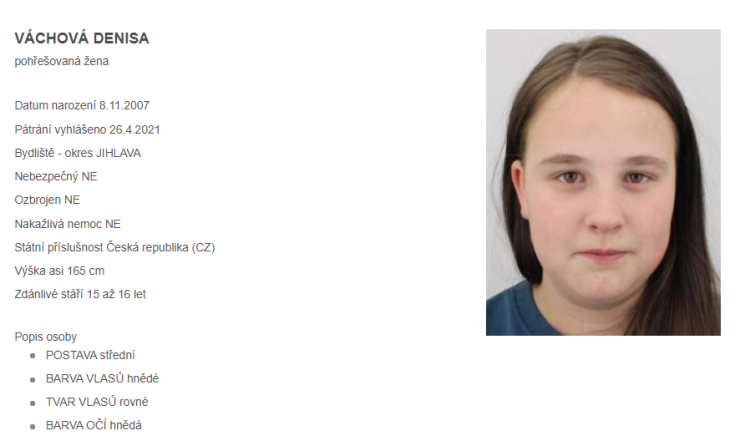 JIHLAVSKO: Třináctiletá dívka odešla v neděli 25. dubna kolem desáté hodiny dopoledne z místa svého bydliště v Hybrálci. Dívka je vysoká přibližně 165 centimetrů, má střední postavu, hnědé oči a hnědé rovné dlouhé vlasy. Naposledy na sobě měla oblečenou černou softshellovou bundu, rifle tmavě šedé barvy, šedé triko s vyobrazením šedého smajlíka a šedou sportovní obuv. Při sobě měla maskáčovou ledvinku.