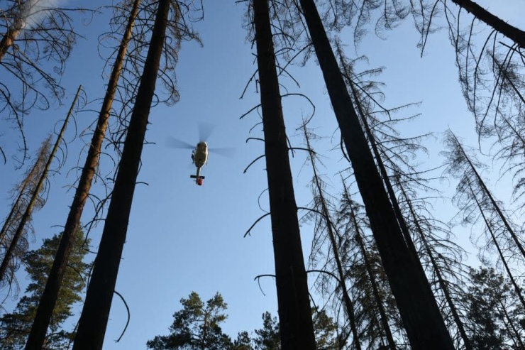 Vyhlášen byl již třetí stupeň požárního poplachu. Na místě zasahuje nyní již 14 jednotek hasičů a nasazen je i vrtulník. Hasební práce komplikuje těžký terén a vysoké teploty.