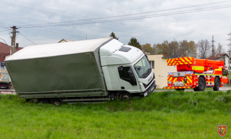 Nákladní automobil zde sjel mimo komunikaci a na podmáčené půdě hrozilo jeho převrácení. Velitel zásahu si povolal automobilový jeřáb Demag ze stanice HZS MSK v Karviné.