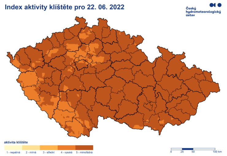 Aktivita klíšťat je dnes na nejvyšším stupni 5 – mimořádné riziko. Doporučujeme před pobytem v přírodě použít repelent, vhodně se obléknout, po pobytu v přírodě se prohlédnout, případně odstranit přisátá klíšťata.