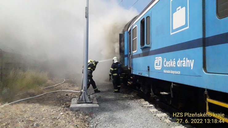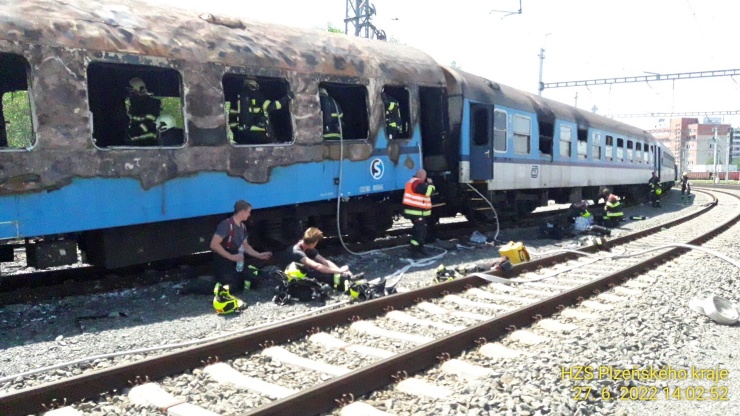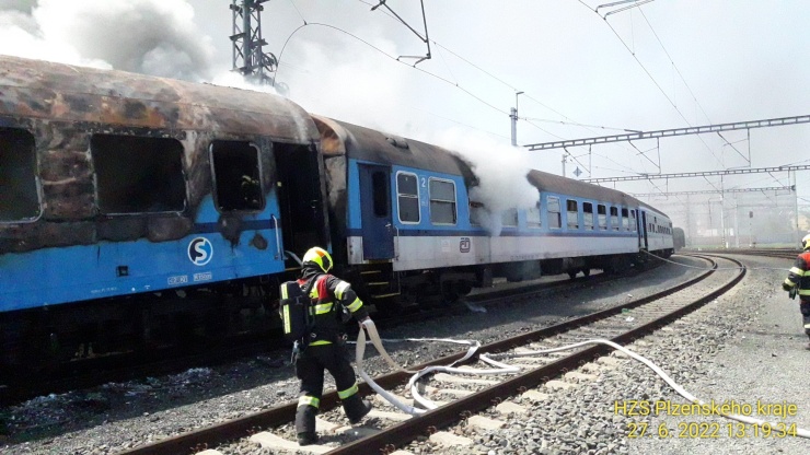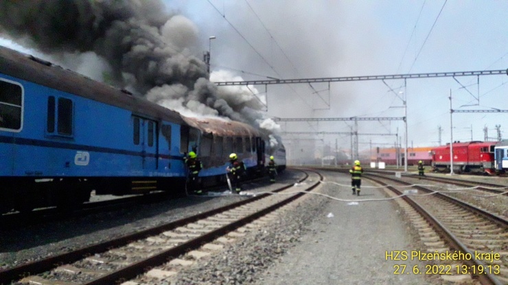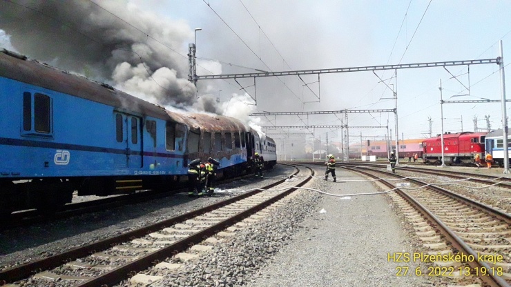 PLZEŇ – Za hlavním nádražím v Plzni nedaleko rozdvojení trati do směrů na České Budějovice a na Prahu hořel vagon osobního vlaku. Šlo o soupravu pěti vagonů bez lokomotivy.