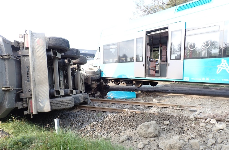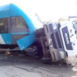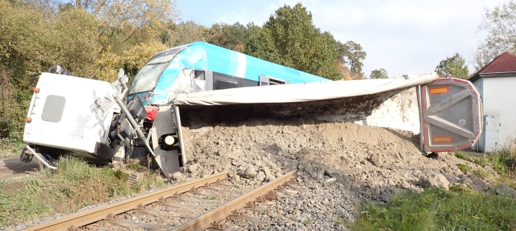 VALAŠSKÉ MEZIŘÍČÍ – Dnes krátce před třetí hodinou odpolední vyjeli profesionální hasiči ze stanic Valašské Meziříčí a Zlín a hasiči města Rožnov pod Radhoštěm do Valašského Meziříčí k nehodě osobního vlaku a nákladního auta na železničním přejezdu mezi Hrachovcem a Zašovou. Při nárazu došlo také k vykolejení vlaku a převrácení náklaďáku na bok.