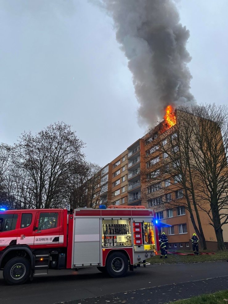 AKTUALIZUJEME VIDEEM: U požáru bytu v nejvyšším patře paneláku v Mostě zasahuje osm hasičských jednotek!
