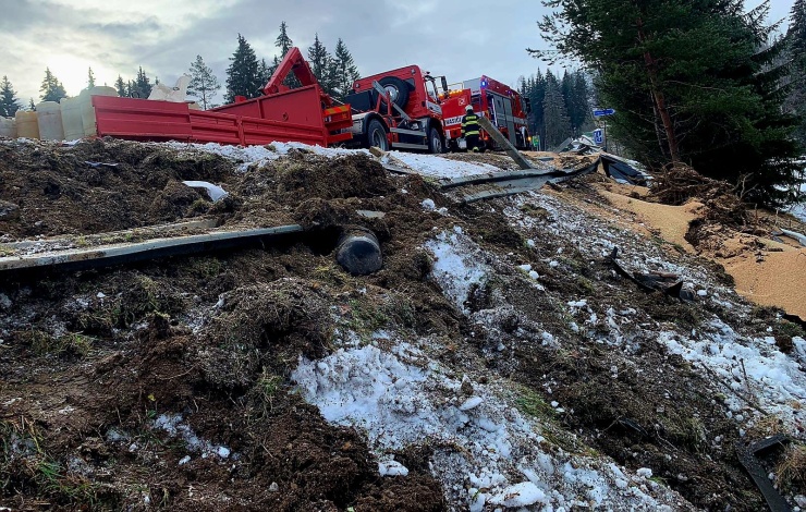Na místě zasahují profesionální hasiči z vimperské a prachatické stanice včetně kontejneru a pomáhají dobrovolní hasiči z Volar. Kamión je přibližně osm metrů pod úrovní vozovky.