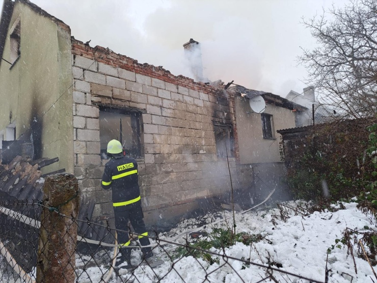 Událost byla původně ohlášena jako požár kotelny domu. Když hasiči na místo přijeli, hořel jednopatrový rodinný dům o půdorysu přibližně 12 x 6 metrů v plném rozsahu. Zároveň se propadla střecha a strop domu. Hasiči ihned zahájili hasební práce. Vytvořili dopravní vedení, natáhli tři „C“ proudy a jeden proud vysokotlaký. Hasební vodu čerpali z blízkého rybníčku, kde nasadili tři plovoucí čerpadla.Vzhledem k nestabilitě objektu zásah probíhal zvnějšku, žádný z hasičů nevstupoval dovnitř.