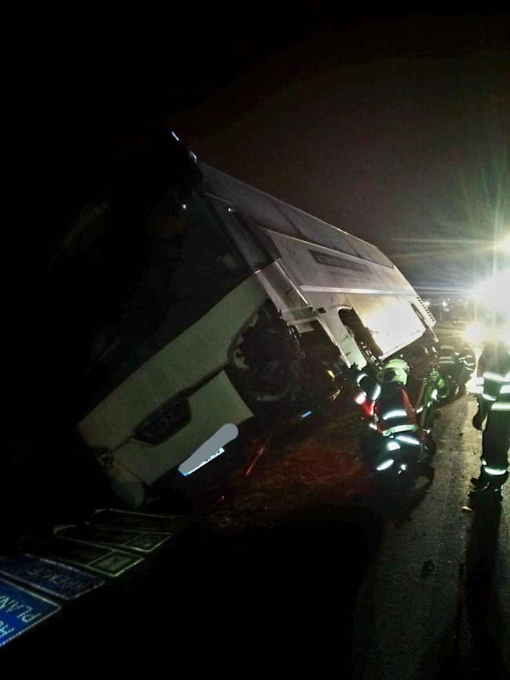 PLANÁ U ČESKÝCH BUDĚJOVIC – Zájezdový autobus leží na boku v příkopu, evakuováno bylo 40 cestujících a dva řidiči, z toho jedno dítě. Někteří z autobusu vylezli sami před příjezdem hasičských jednotek, ostatním s evakuací přes vrchlík autobusu pomohli.