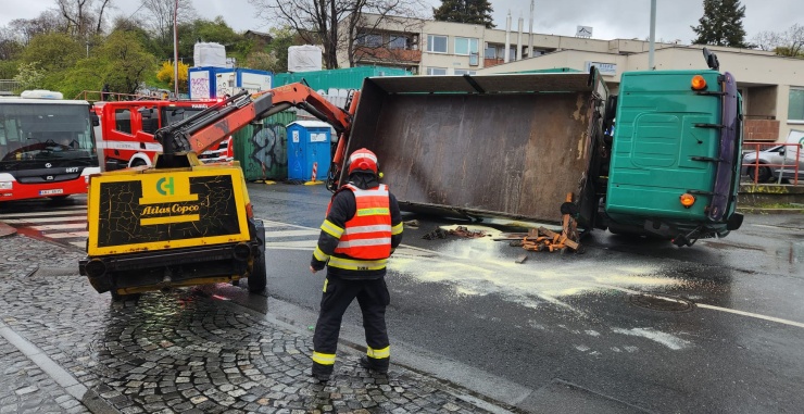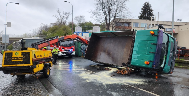 PRAHA – V ulici Chelčického v Praze 3 zasahují složky Integrovaného záchranného systému ČR u převráceného nákladního vozu u vjezdu na stavbu.