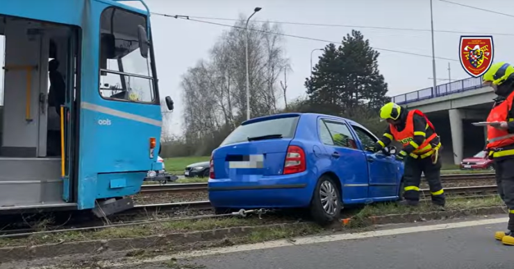 VIDEO: Při střetu osobního vozu a tramvaje v Ostravě museli hasiči vyprostit vozidlo z kolejiště