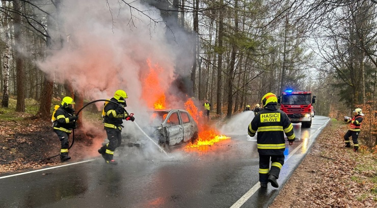 Z automobilu vyšlehly za jízdy plameny. Nikdo nebyl při požáru osobního vozu naštěstí zraněn. Příčina vzniku požáru byla podle hasičského vyšetřovatele technická závada.