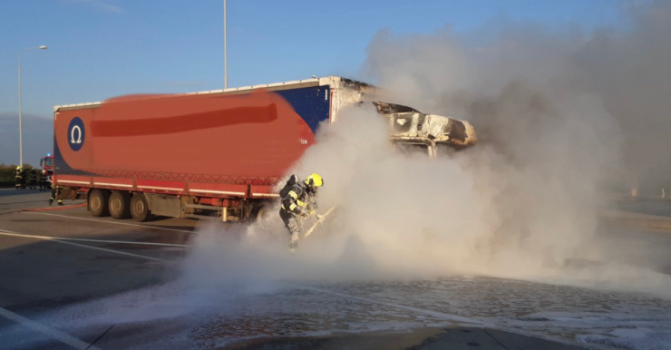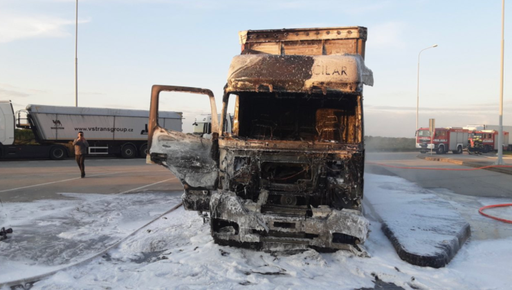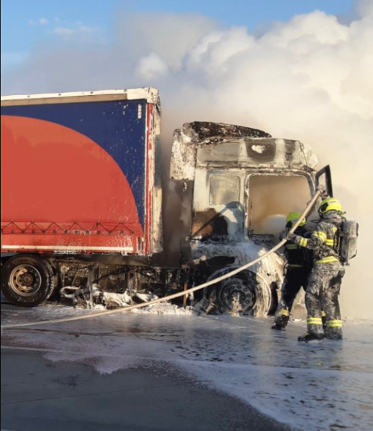 OLOMOUCKÝ KRAJ – Hořící kamion u čerpací stanice včera v podvečer uhasili přivolaní hasiči na dálnici D1 na 249. kilometru ve směru na Vyškov. Díky rychlému zásahu čtyři jednotky hasičů zabránily rozšíření požáru i na návěs. Řidič kamionu stačil před plameny z hořící kabiny vyskočit.