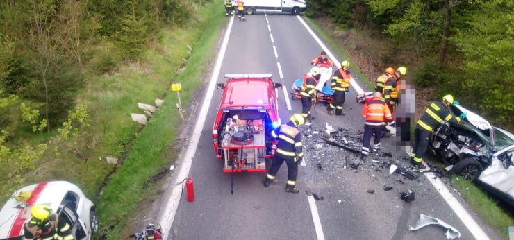 PŘÍBRAMSKO – U střetu dvou osobních automobilů zasahují profesionální hasiči z Příbrami a dobrovolní z Rožmitálu pod Třemšínem na Příbramsku.