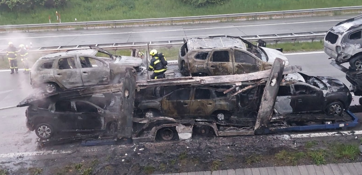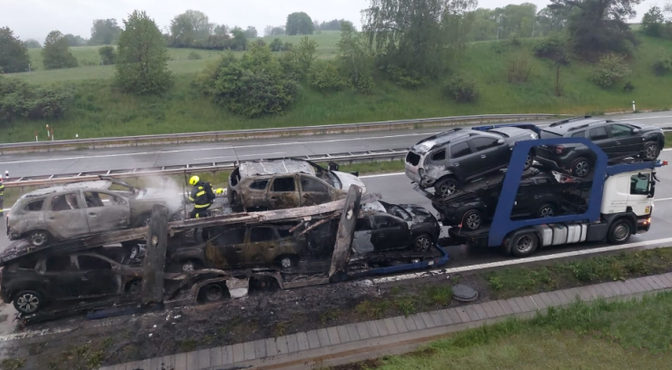 OSTŘEDEK – V pondělí 15. května v časných ranních hodinách přijala tísňová linka středočeských hasičů oznámení o požáru nákladní soupravy s převáženými osobními vozidly na brněnské dálnici D1 za 38. kilometrem ve směru do Prahy.