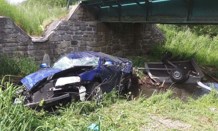 TRAGÉDIE: Havarované auto s vozíkem skončilo v korytě potoka pod silničním a železničním mostem na Svitavsku! Řidič nehodu nepřežil
