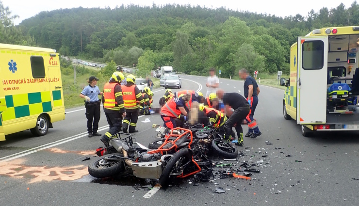 ZLÍNSKO – K těžké dopravní nehodě dvou motocyklů na silnici I/50 nedaleko obce Střílky vyjížděli včera krátce po třetí hodině odpoledne profesionální hasiči ze stanic Morkovice Slížany a Uherské Hradiště, a také dobrovolná jednotka z Koryčan.