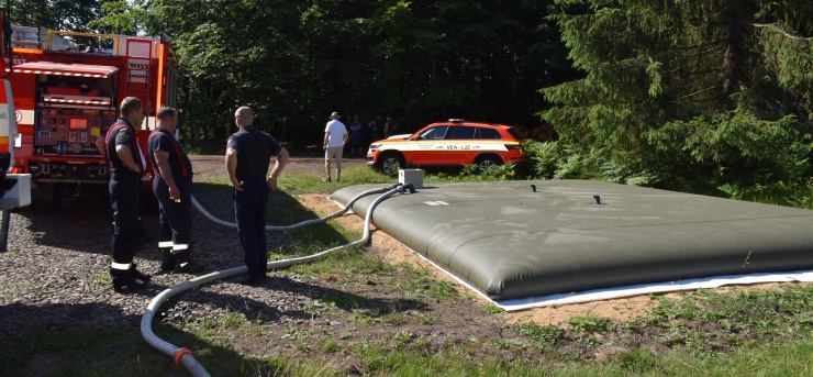 ZADNÍ DUBICE – Hasiči v Zadní Doubici začali plnit první vak na hasební vodu. Těchto vaků má být 12 postupně rozmístěno v Národním parku České Švýcarsko.
