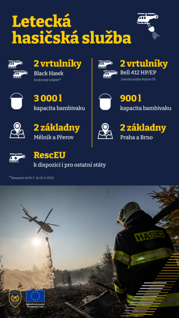 Následující dva měsíce budou zabezpečovat službu leteckého hašení nad rámec běžného fungování Letecké služby Policie ČR navíc dva vrtulníky Sikorsky UH60A Black Hawk firmy HELI COMPANY s.r.o. Je to výsledek veřejné zakázky, kterou vyhlásilo v uplynulých týdnech Ministerstvo zemědělství. Smlouva s vítěznou firmou byla podepsána v pátek 14. 7. 2023. Předmětem veřejné zakázky je zajištění letecké hasičské služby v celkovém rozsahu až 180 hodin za pomoci dvou vrtulníků, každý s minimální nosností 3 tisíce litrů vody po dobu dvou měsíců v období od 15. 7. do 15. 9. 2023 na území České republiky, případně také na území účastnických států Mechanismu civilní ochrany Unie. Spolu s nimi jsou nadále připraveny zasáhnout také dva policejní vrtulníky, které zajišťovaly letecké hašení doposud.