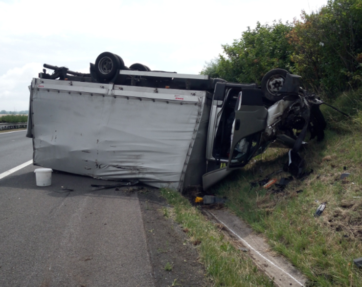 Obě vozidla po nárazu skončila na boku. Dva lidé utrpěli zranění. Dálnice byla v tomto směru zcela uzavřena.
