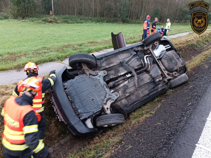 OBRAZEM: Ve Valašském Meziříčí na Vsetínsku skončilo osobní auto na boku v příkopu