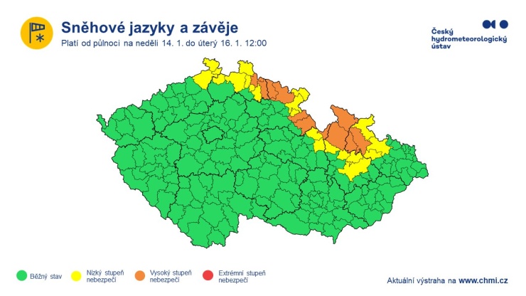 ČESKO – Od neděle 14. ledna se budou v důsledku kombinace mírného až čerstvého větru západních směrů, přechodně s nárazy kolem 55 km/h, na horách až 90 km/h a nového sněhu (v oblasti s výstrahou napadne do úterního poledne 5 až 20 cm, v horských oblastech 20 až 50 cm) na severu a severovýchodě území místy vytvářet sněhové jazyky, zejména v Jizerských horách, Krkonoších, Orlických horách a Jeseníkách i závěje.