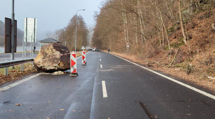HŘENSKO – Minimálně do neděle 28. ledna zůstane uzavřena silnice I/62 ve Hřensku poblíž hranice s Německem po včerejším pádu několikatunového pískovcového balvanu, který se zřítil ze svahu. Obrovský kámen se skutálel ze svahu a skončil ve svodidlech. Při tomto incidentu se naštěstí nikomu nic nestalo. V místě hrozí další pády kamenů…