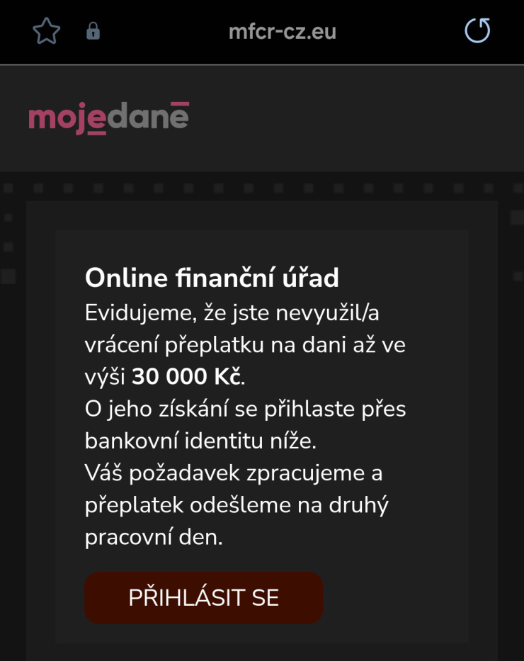V SMS jsou odkazy na podvodný web mfcr-cz.eu či adissprmfcr-cz.eu, které s Ministerstvem financí a Finanční správou nemají nic společného. Internetová stránka předstírá, že se jedná o Online finanční úřad v rámci portálu MOJE Daně.