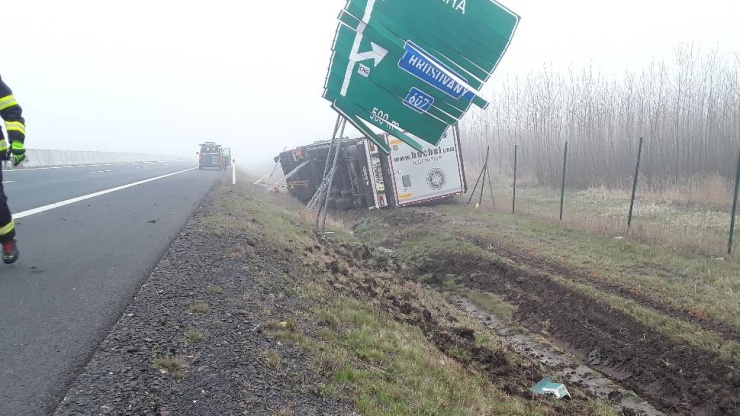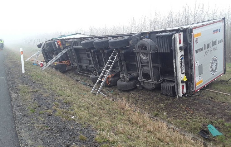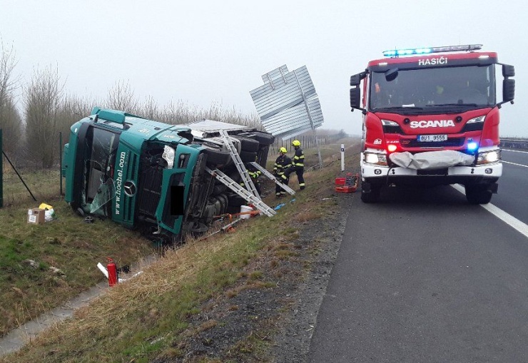 CHOMUTOVSKO – U Nezabylic na Chomutovsku na dálnici D7 zasahovaly dnes ráno složky Integrovaného záchranného systému ČR u nehody kamionu, který skončil mimo vozovku na boku v příkopu.