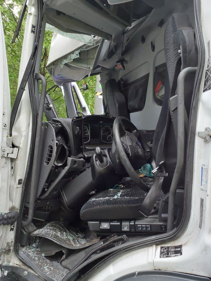 Z kabiny jednoho nákladního automobilu bylo nutné vyprostit zaklíněného řidiče. Hasiči museli použít nejen hydraulické vyprošťovací zařízení, ale i řetězy, kterými museli vytvořit prostor, aby se dostali k řidiči. Toho poté šetrně vyprostili ze zdemolované kabiny.