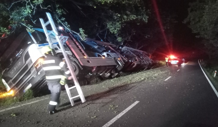 VELKÁ JESENICE – V noci zabezpečila jednotka profesionálních hasičů z HZS Jaroměř místo nehody kamionu naloženého osobními vozy, havaroval na silnici II/285 u Velké Jesenice na Náchodsku.