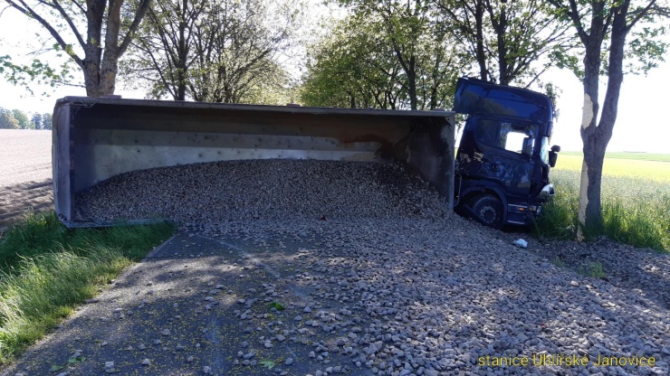 KUTNOHORSKO – Složky Integrovaného záchranného systému ČR zasahují na silnici mezi obcemi Nechyba a Podveky na Kutnohorsku, kde havaroval nákladní automobil, který zde skončil napříč silnicí a vysypal na vozovku náklad.