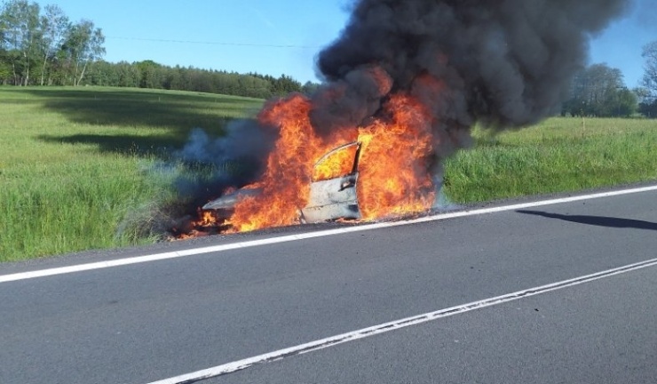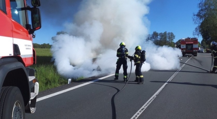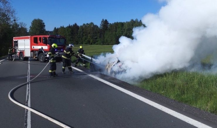 Nasazen byl dostatečný počet proudů vody k likvidaci požáru. Automobil skončil v příkopu. Posádka vozu před plameny naštěstí unikla. Projíždějte s opatrností.