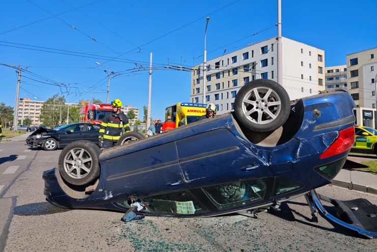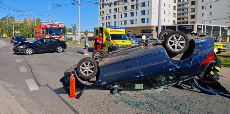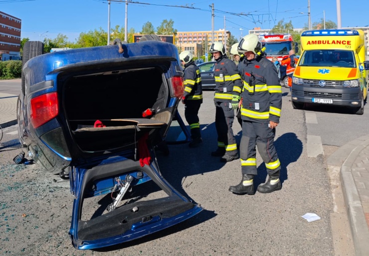 ČESKÉ BUDĚJOVICE – U včerejší nehody dvou osobních aut na sídlišti Vltava v Českých Budějovicích zasahovaly složky Integrovaného záchranného systému ČR. Jedno z havarovaných vozidel skončilo po střetu na střeše!