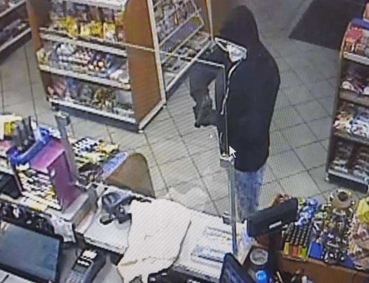 Na sobě měl oblečenou mikinu tmavé barvy s kapucí, modré kalhoty, přes obličej měl roušku, na očích sluneční brýle a na rukou měl nasazené černé rukavice. V ruce držel střelnou zbraň, se kterou namířil na muže za pultem a dožadoval se vydání peněz, které mu obsluha vydala. Pachatel požadoval také stírací losy a mobilní telefon. Následně místo činu opustil a odešel směrem na Plzeň.