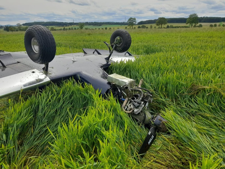 ŽDÁR U PROTIVÍNA – Při nouzovém přistání utralichtu u Ždáru u Protivína uhynul srnec, ukrytý v poli. Letoun skončil po nárazu na střeše! Pilot vyvázl z kuriózní letecké nehody bez zranění.