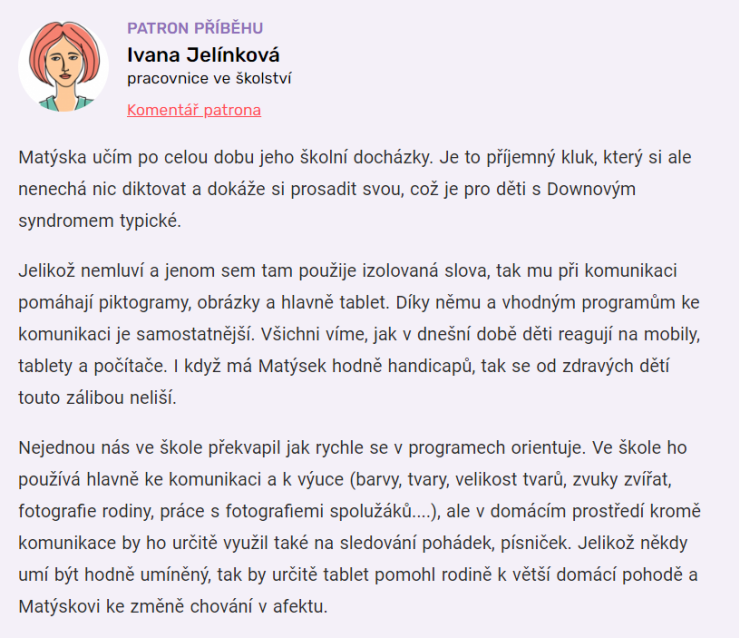 V jeho osobním rozvoji má Matyášek rád sportovní hry, používání tabletu a výlety. Tyto aktivity mu pomáhají k uvolnění a radosti, které jsou pro něj velmi důležité,“ dodává jeho rodina na webu Patron dětí, kde může přispět opravdu každý. každá finanční pomoc se počítá.