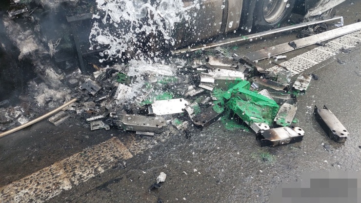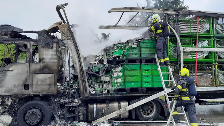 Požár je již zlikvidován, ale i nadále probíhá na místě vykládka návěsu zasaženého požárem. Jak dlouho to bude trvat nelze v tento okamžik říci. Části nákladu jsou vlivem žáru spečené do sebe.